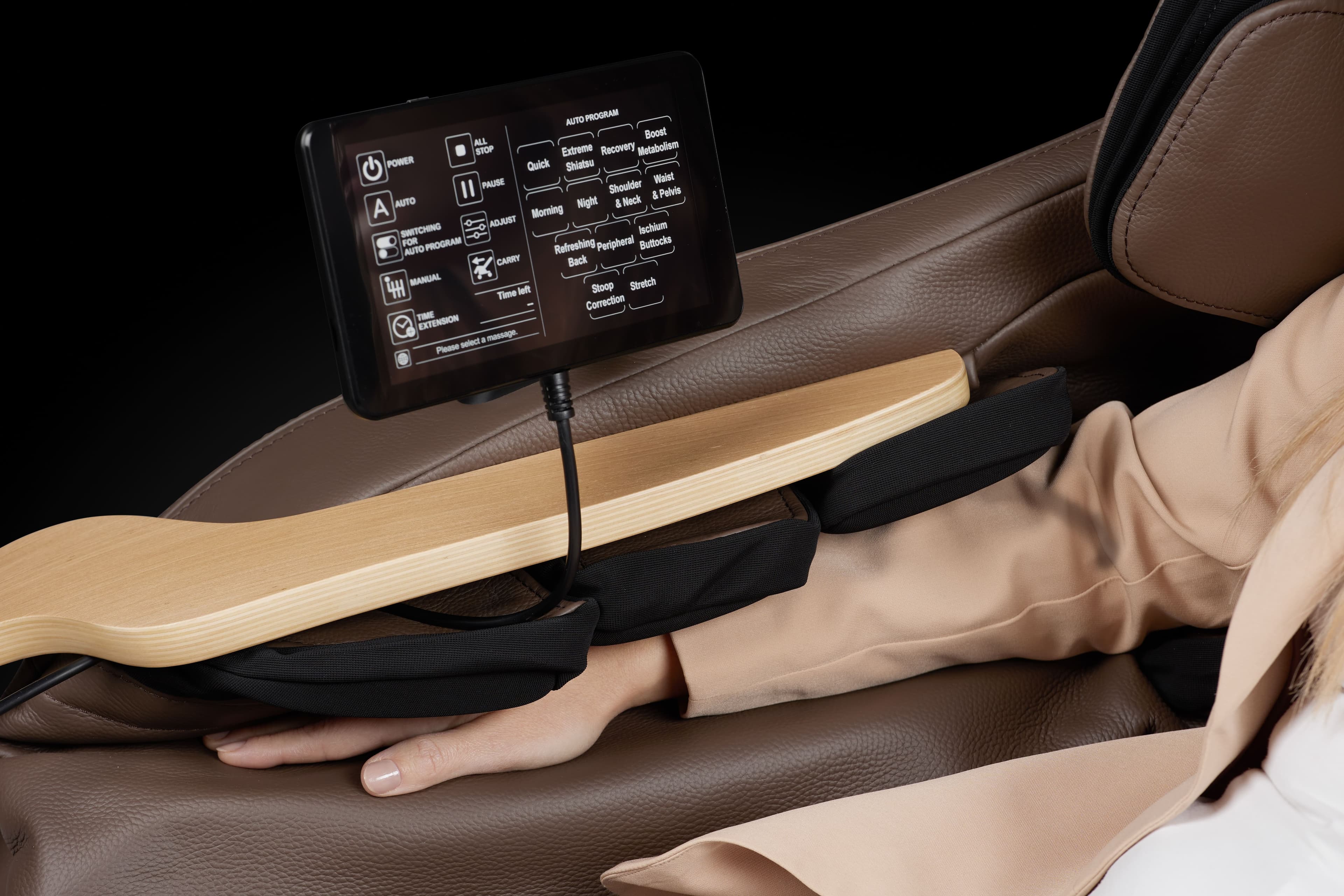 Il touchscreen semplifica il controllo e la personalizzazione dei massaggi. Il controllo della poltrona è semplice grazie al tablet e ai pulsanti di scelta rapida, posizionati sul bracciolo sinistro, che consentono una rapida regolazione delle impostazioni e il massimo comfort in ogni momento.